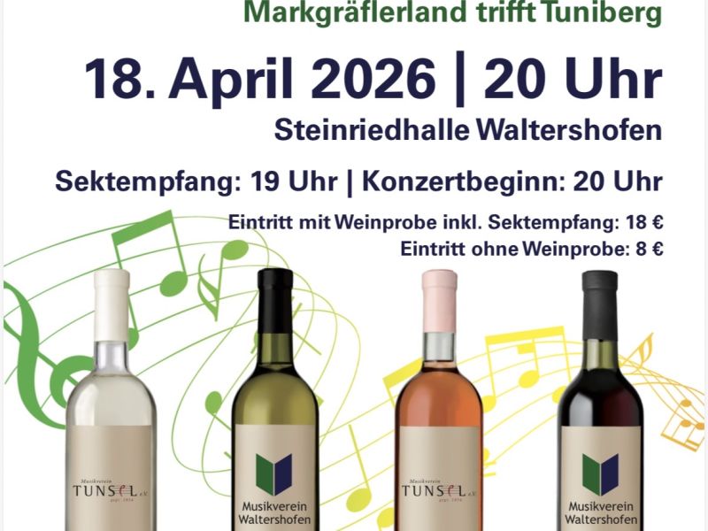 Unter dem Motto „Markgräflerland trifft Tuniberg“ laden der Musikverein Waltershofen und der Musikverein Tunsel am 18.April 2026 zu einem besonderen Doppelkonzert in die Steinriedhalle Waltershofen ein.