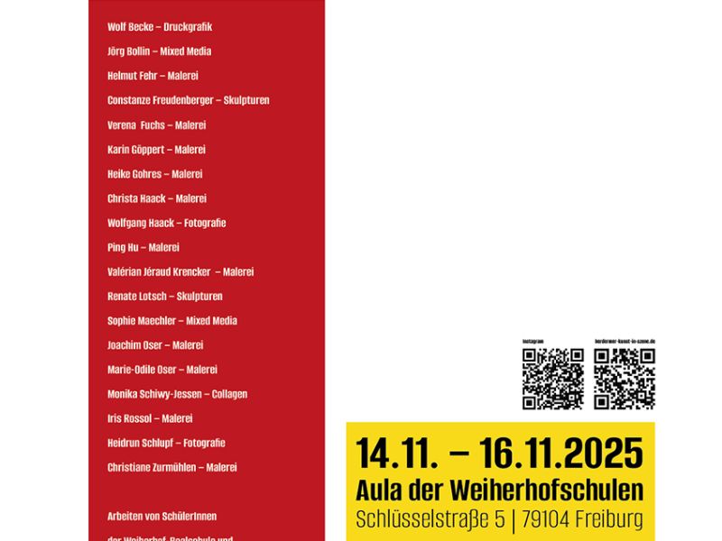 Künstlerinnen und Künstler aus Freiburg und von der Organisation ausgewählte GastkünstlerInnen, SchülerInnen der Weiherhof Realschule und Droste-Hülshoff-Gymnasium zeigen wieder Malerei, Fotografie, Druckgrafik, Mixed Media und Skulpturen.