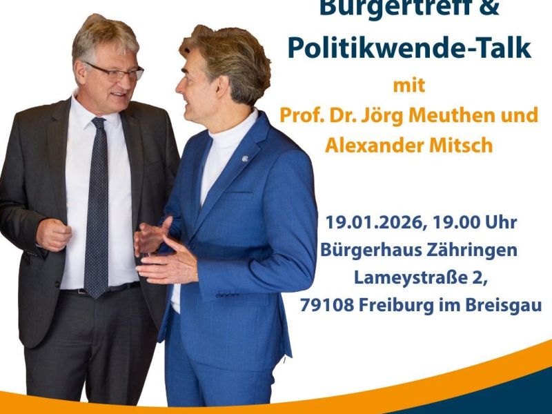 Beschreibung: Im Vorfeld der Landtagswahl am 8. März lädt die WerteUnion herzlich zu einem Bürgertreff ein. Die Spitzenkandidaten Prof. Dr. Jörg Meuthen und Alexander Mitsch stellen sich den Fragen der Bürgerinnen und Bürger und diskutieren zentrale wirtschaftspolitische Themen, die für die Zukunft unseres Landes entscheidend sind.