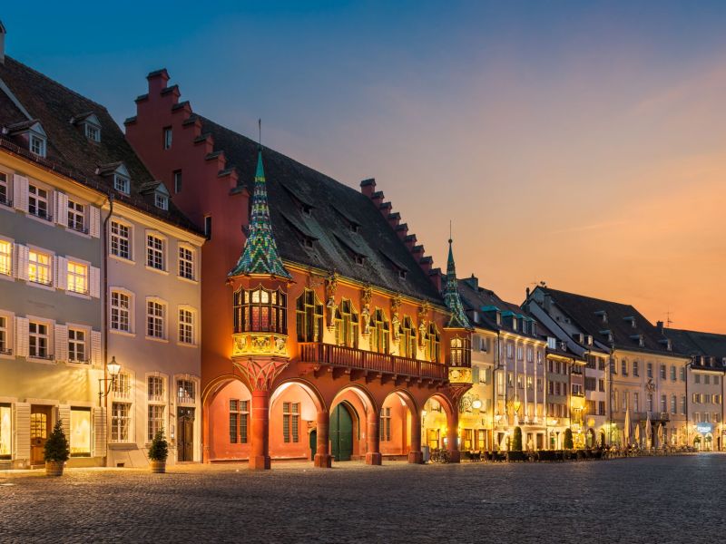 Das dunkelrote Historische Kaufhaus mit seinen reich verzierten Erkern ist ein echter Blickfang am Münsterplatz. In der ersten Hälfte des 16. Jahrhunderts wurde es von Münster-Baumeister Lienhart Müller errichtet für die städtische Markt-, Zoll- und Finanzverwaltung.