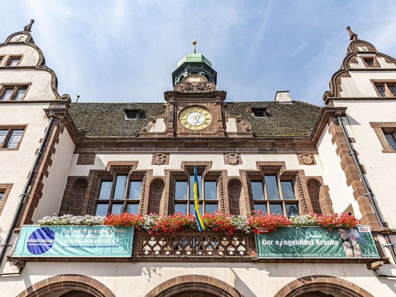 Das Neue Rathaus entstand einst aus der Verbindung zweier prachtvoller Renaissance-Häuser, die durch ein repräsentatives, giebelgeschmücktes Säulenportal geschaffen wurde. Nach etlichen Umbaumaßnahmen erhielt das Neue Rathaus Ende des 19. Jahrhundert sein heutiges Aussehen. Größere Fenster, Balkone und Erker schmücken seither den weiß getünchten Bau. Auch das Innere des Neuen Rathauses ist ein wahres Juwel. Aufwendige Holzschnitzereien und Stuckornamente an den Decken zaubern ein romantisches Flair in die großzügigen Räumlichkeiten. Hier, in den ehemaligen Arbeitsräumen des Nordflügels, geben sich die Freiburger besonders gerne das „Ja-Wort“.