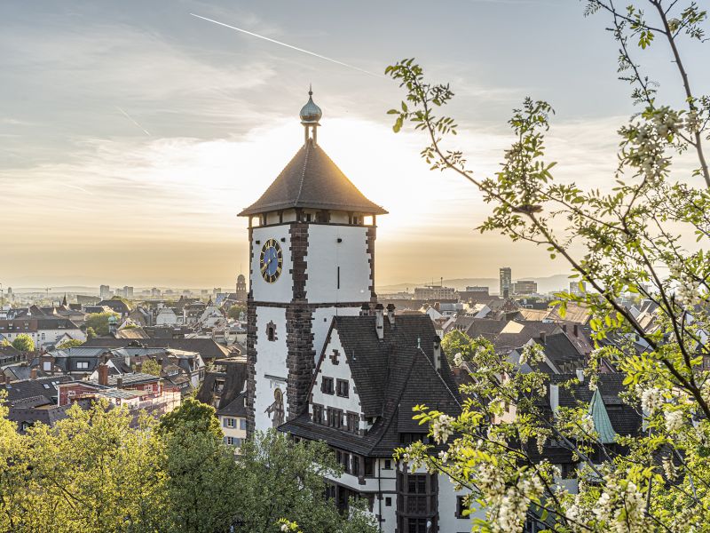 Wer dennoch über die Salzstraße durchs Schwabentor trat, gelangte über die Dreisambrücke auf die wichtigsten Handelswege des Schwarzwaldes. Über eine dieser Routen soll übrigens einst aus Schwaben ein Salzkaufmann nach Freiburg gekommen sein, der sich in die Stadt verliebt hatte. Mit mehreren Fässern voller Geld wollte er Freiburg kaufen; von den Bürger*innen gab‘s nur Spott und Gelächter – erst recht als er die Fässer öffnete und bemerkte, dass seine Frau heimlich das Geld gegen Sand und Steine getauscht hatte. Dieser Legende verdankt das Schwabentor seinen Namen, der Salzkaufmann ziert seit dem 17. Jahrhundert die Innenseite. Auf der Außenseite prangt der Schutzpatron Freiburgs: der Drachentöter St. Georg.