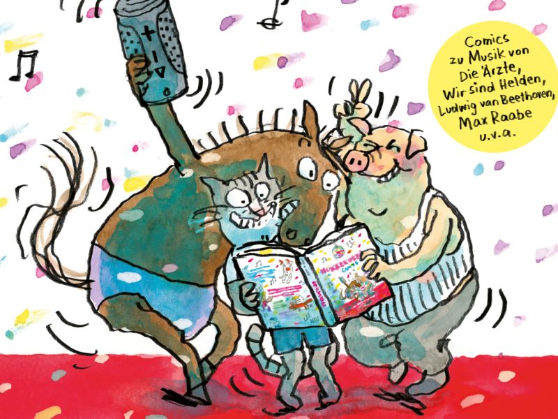 The two artists Anke Kuhl and Moni Port have invited sixteen renowned comic and children's book artists, from Axel Scheffler to Nadia Budde, to transform German-language songs and pieces of music into comics. "Mukkekukke. Comics zu Musik" (Reprodukt, 2024) is a rousing visual playlist, a delightfully exuberant showcase of current comic art, honored as one of the "Poetry Recommendations for Children 2025" by the German Academy for Language and Poetry, among others. A book that tickles all the senses.
