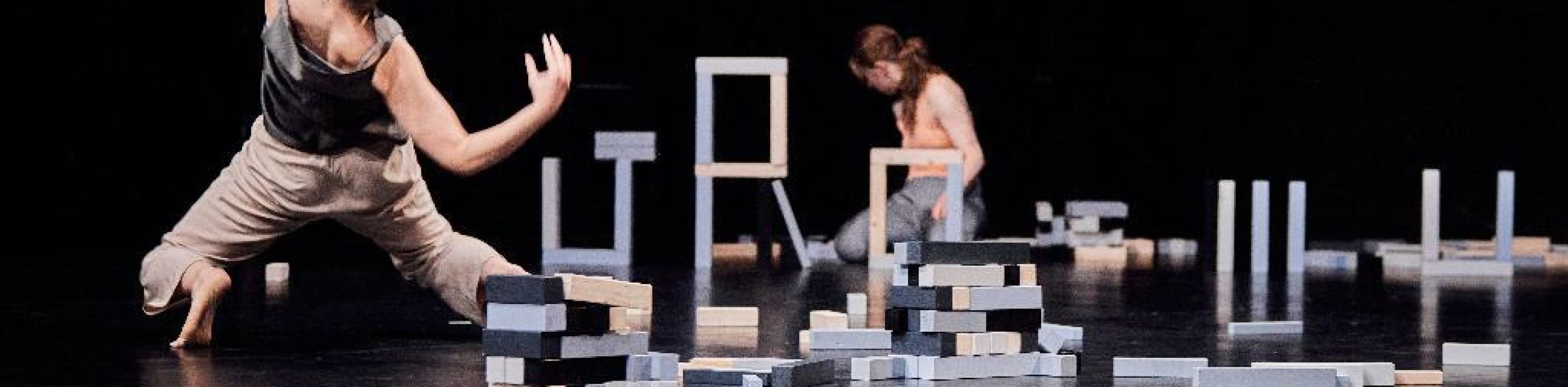 In front of a stage with hundreds of wooden bricks, they move in an endless loop of destruction and construction. Images emerge in the shifting landscape - fragments that reflect ruins, battles and aftermath - evoking scenes that inevitably recall wars and conflicts, aligning the work with the tensions of our present.