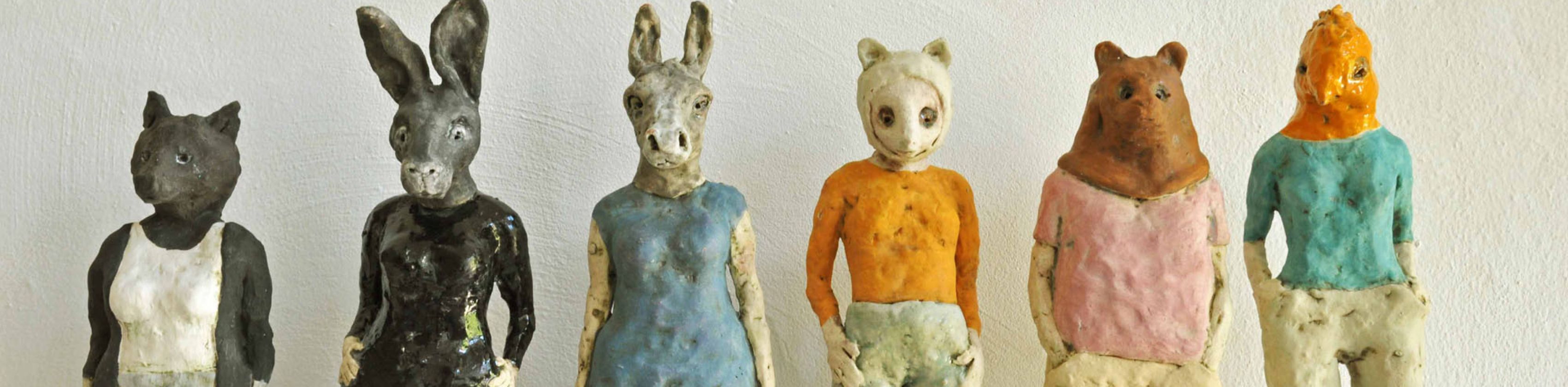 Who do I secretly feel crouching on my shoulders, what would my invisible companion look like and where is my sense of security? A feeling can take on different shapes and colors or meet us in our imagination in the form of an animal. Together we want to invent such hybrid creatures by combining human and animal forms or inventing completely new creatures. Based on sketches, photos or collages we bring with us, the ideas will be translated into a sculptural form. We will learn how to use the simple sausage technique with a few tricks to create large, thin-walled yet stable figures. We will then paint the figures several times with colorful sintered enamels. We will also show how a copper oxide solution can be used to create depth in the surfaces after firing. Anna Dorothea Klug studied ceramics in Halle and the USA. Her drawings and watercolors serve as models for her ceramic sculptures, some of which are life-size, which she later assembles into surreal worlds in installations.
