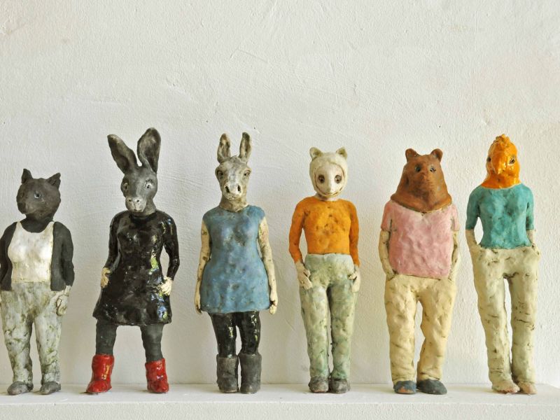 Who do I secretly feel crouching on my shoulders, what would my invisible companion look like and where is my sense of security? A feeling can take on different shapes and colors or meet us in our imagination in the form of an animal. Together we want to invent such hybrid creatures by combining human and animal forms or inventing completely new creatures. Based on sketches, photos or collages we bring with us, the ideas will be translated into a sculptural form. We will learn how to use the simple sausage technique with a few tricks to create large, thin-walled yet stable figures. We will then paint the figures several times with colorful sintered enamels. We will also show how a copper oxide solution can be used to create depth in the surfaces after firing. Anna Dorothea Klug studied ceramics in Halle and the USA. Her drawings and watercolors serve as models for her ceramic sculptures, some of which are life-size, which she later assembles into surreal worlds in installations.