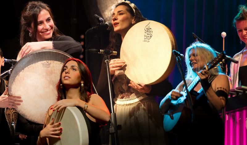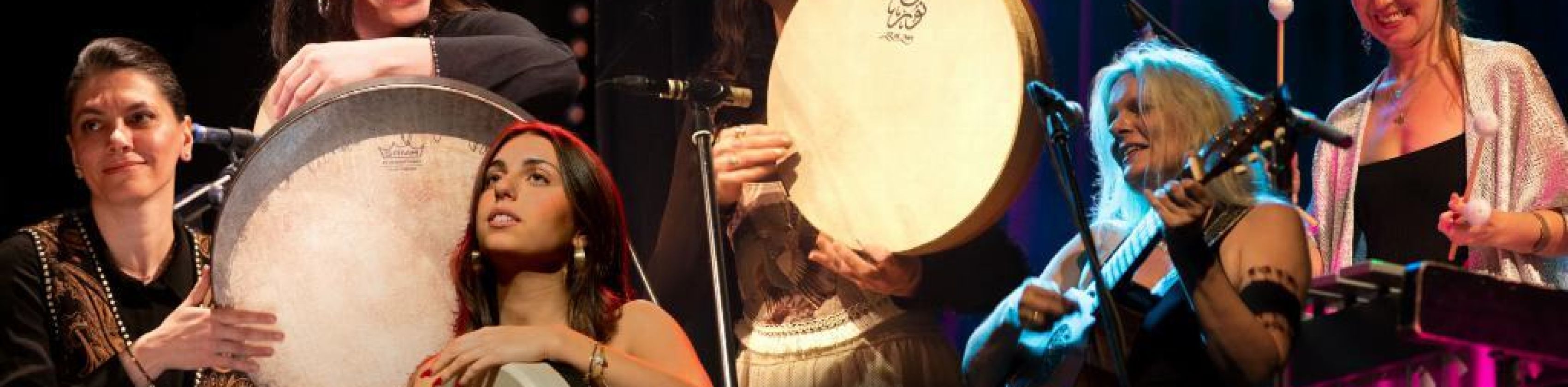 Kasia Kadlubowska from Poland enjoys the exciting balance between contemporary music, tribal pop and traditional folk music from Central and Eastern Europe. With mallets on the vibraphone and a great love of frame drum music, she follows her own musical path. Sara Fotros, an Iranian musician from London, performs powerful percussion on the Persian-Kurdish frame drum Daf. Gesine Bänfer from Freiburg is at home with "wind and strings" in both early music and folk music. Isabel Martín from Spain traces the roots of Mediterranean music cultures with her singing and the Iberian frame drum Pandero Cuadrado. Malika Coskun sets her own percussive accents as a young voice.