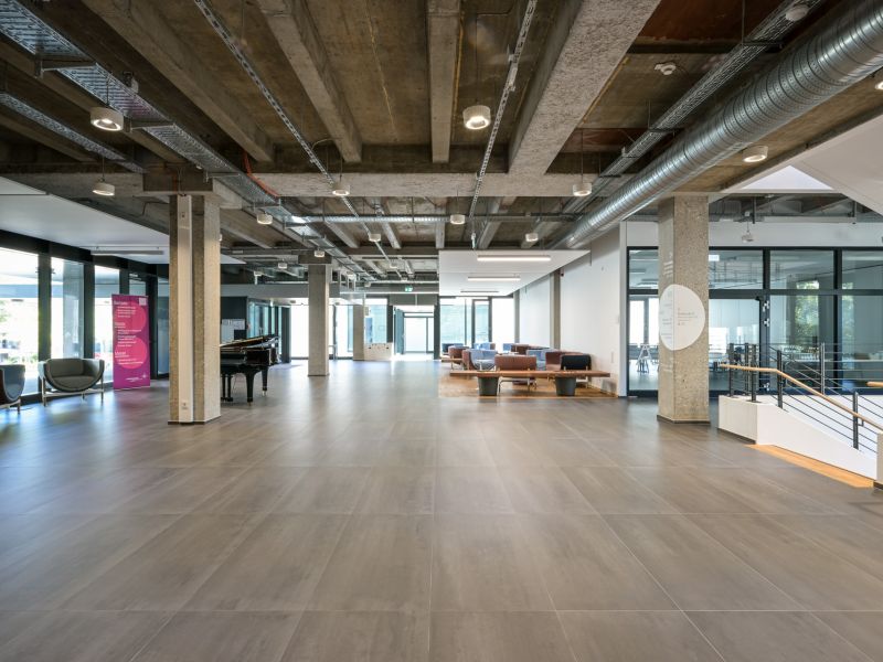 The extension has increased the university's room capacity by about a third. The building has a large lecture hall, a cafeteria with canteen, seminar rooms and offices. It was designed as an open and transparent communication space. A friendly atmosphere is created inside by the daylight, which is optimally used by the large-scale glazing. To be viewed from the outside and inside.