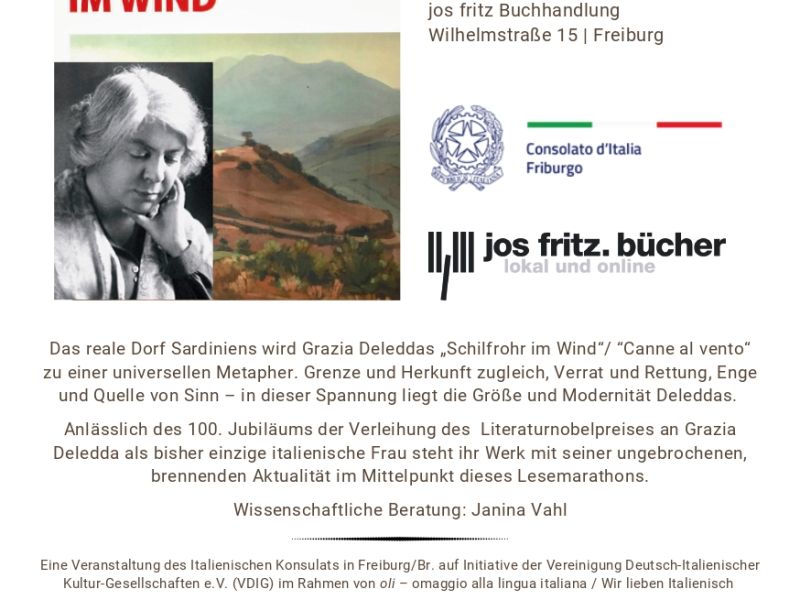 Le Consulat d'Italie et la librairie Jos Fritz, en collaboration avec la Fédération des sociétés germano-italiennes, ont le plaisir de vous inviter au 12e marathon de lecture de la VDIG, dédié cette année à Grazia Deledda, à l'occasion du centenaire de l'attribution du prix Nobel de littérature (1926-2026).