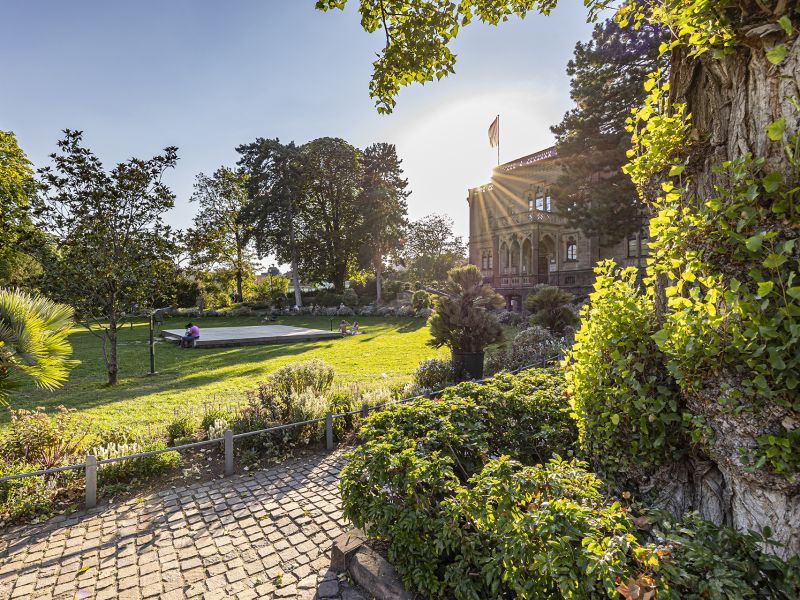 Mais déjà le regard sur le somptueux et romantique château et le vaste parc fait revivre le passé. La comtesse Maria Antonia Gertrudis von Zea Bermudez y Colombi a fait construire son siège de veuve sur l’emplacement de l’ancien bastion français Saint Louis. C’est entre 1859 et 1861 que l’architecte fribourgeois Georg Jakob Schneider érigeait l’ancienne maison de maître dans le style Tudor gothique et enjoué de l’ère médiéval britannique. Au centre du jardin luxueux, entouré de massifs de fleurs, de fontaines et de sculptures, le château apparaît comme une Fata Morgana du 19ème siècle. Laissez-vous simplement ensorceler !